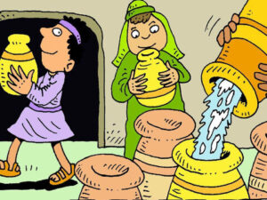 「さて、そこには、ユダヤ人のきよめのしきたりによって、それぞれ八十リットルから百二十リットル入りの石の水がめが六つ置いてあった。」(6) これらの水がめの水は、儀式用の水で、2つの目的のために使われました。家に入る時に、足を洗い清めるためと、食事の前に、手を洗うために使われました。「イエスは彼らに言われた。「水がめに水を満たしなさい。」彼らは水がめを縁までいっぱいにした。」(7) 「手伝いの人たち」は、不平不満も言わず、全てイエスが言われる通りに、作業しました。