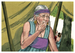 サラはアブラハムの妻であり、いつもアブラハムとともに歩み、従ってきました(Ⅰペテロ3:6)。ある日、3人の旅人がアブラハムのところに来ました。そのうち1人は主でした(創世記18:1131422ほか)。アブラハムは彼らを見て、ただの旅人ではないことを悟り、引き留め、おいしい食事を与えて彼らをもてなしました。すると、彼らの一人がサラに子供が生まれると言いました。しかし、アブラハムはこのとき99歳で、サラは89歳でした(創世記21:517:17)。サラは「子供が生まれる」と聞いて、心の中で笑い、「自分も夫も老いぼれたので子どもが生まれるはずがない」と言いました。しかし、主がサラの心の中の言葉も読み取って、「なぜ笑うのか」と責めました。サラはすぐに笑ったことを否定しましたが、主は「確かに笑った」と言いました。しかし、その神の言葉は実現したのです(創世記21:1-7)。