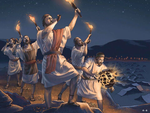 ギデオンは、「三百人を三隊に分け、全員の手に角笛とからつぼとを持たせ、そのつぼの中にたいまつを入れさせ」ました(7:16)。そして、兵士たちに「私を見て、あなたがたも同じようにしなければならない」、「私がするように、あなたがたもそうしなければならない」(7:17)、「角笛を吹いたなら、あなたがたもまた、全陣営の回りで角笛を吹き鳴らし、『主のためだ。ギデオンのためだ』と言わなければならない」(7:18)と言いました。「三百人」の兵士たちは、ギデオンと一緒に行動しなければなりませんでした。すなわち、一致が要求されたのです。