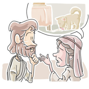 「子供たち」とはユダヤ人のこと。「小犬」とは異邦人のこと。「パン」は神の祝福です。