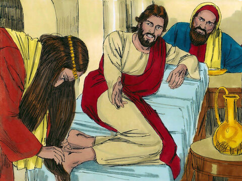 すると彼女は「泣きながら、イエスのうしろで御足のそばに立ち、涙で御足をぬらし始め、髪の毛でぬぐい、御足に口づけして、香油を塗った」(38)のです。当時、ユダヤ人たちは左肘をついて横たわって、両足を右側に伸ばすような恰好で食事をしていました。この女は、食卓に着いて横になっていたイエスの足元に立ったのです。